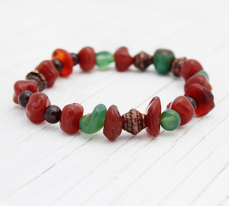 Genuine, vintage cognac amber and adventurine nuggets fit together for perfect earthy tones. Accented with deep, rich garnet beads and bronze.